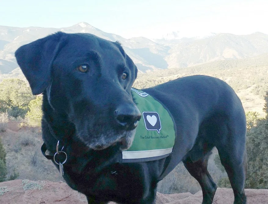 Before long, my clients began asking if Zeus would be at their sessions. So it only made sense to get him a Grief Recovery vest, one he wore proudly wherever we went.